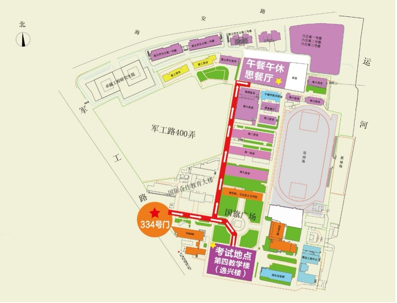 考试当天考生按要求携带好相应材料,从军工路334号门(见下图)进入。请考生根据路程远近自行安排,预留足够时间配合考点工作人员进行入场核验。